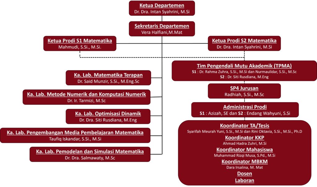 PSM FMIPA USK dipimpin oleh seorang ketua program studi yang dibantu oleh sekretaris program studi yang dipilih setiap 4 tahun sekali. Ketua dan sekretaris PSM membawahi tiga koordinator yang mengurusi bidang-bidang tugas yang khusus, yaitu: Koordinator Bidang Akademik, Koordinator Bidang Perencanaan, serta Koordinator Bidang Kemahasiswaan. Dalam menjalankan visi dan misinya, PSM didukung oleh 5 peer group, yaitu Matematika Murni, Pembelajaran Matematika, Aplikasi Dinamis dan Optimasi (ADO), Etnomatematika, dan Matematika Aktuaria.